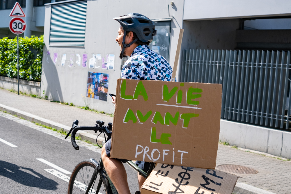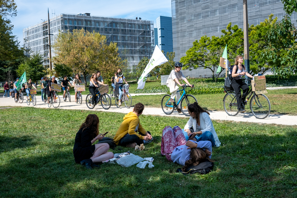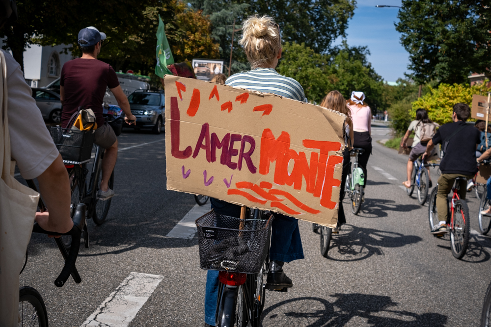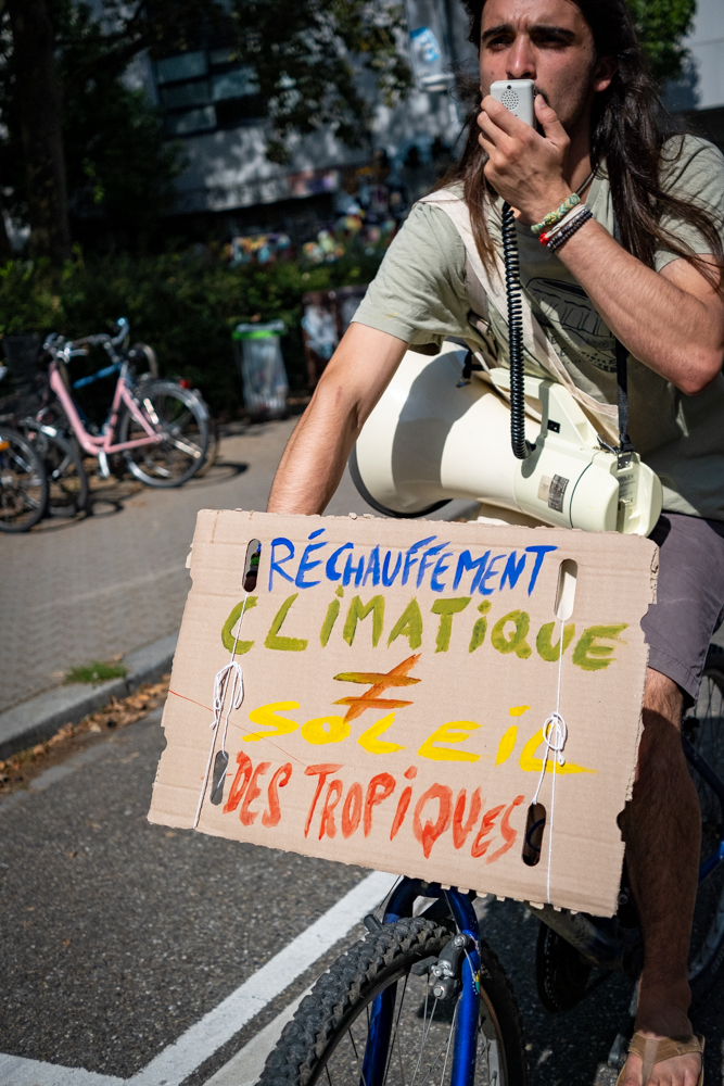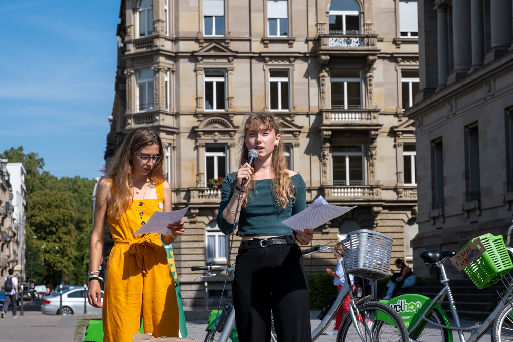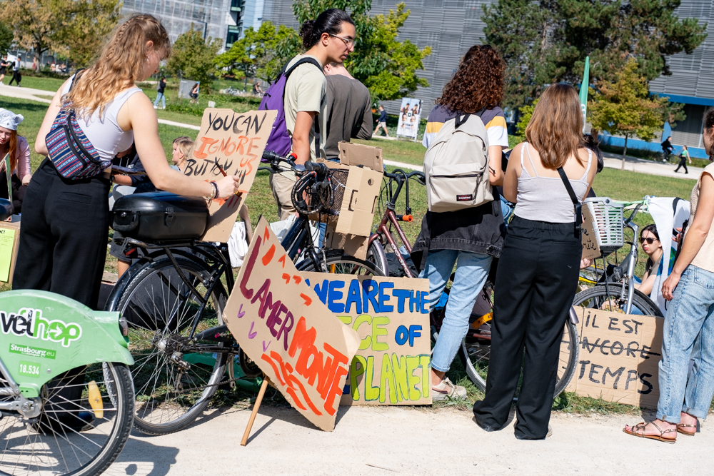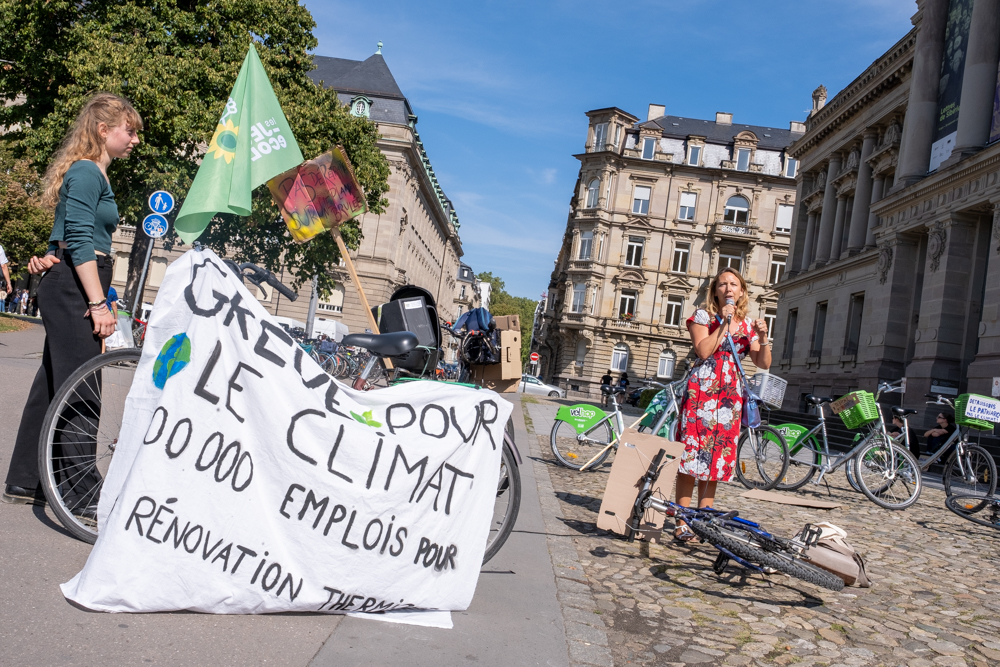 Un cortège est parti du Campus, passant par l’avenue de la Forêt-Noire, le lycée Kléber pour faire une halte à la place de la République où des discours ont appelé à la vigilance face à la récupération par l’extrême-droite de la question écologique, à la nécessité d’engager des moyens conséquents à rénovation thermique des bâtiments, de justice sociale et entre les générations.