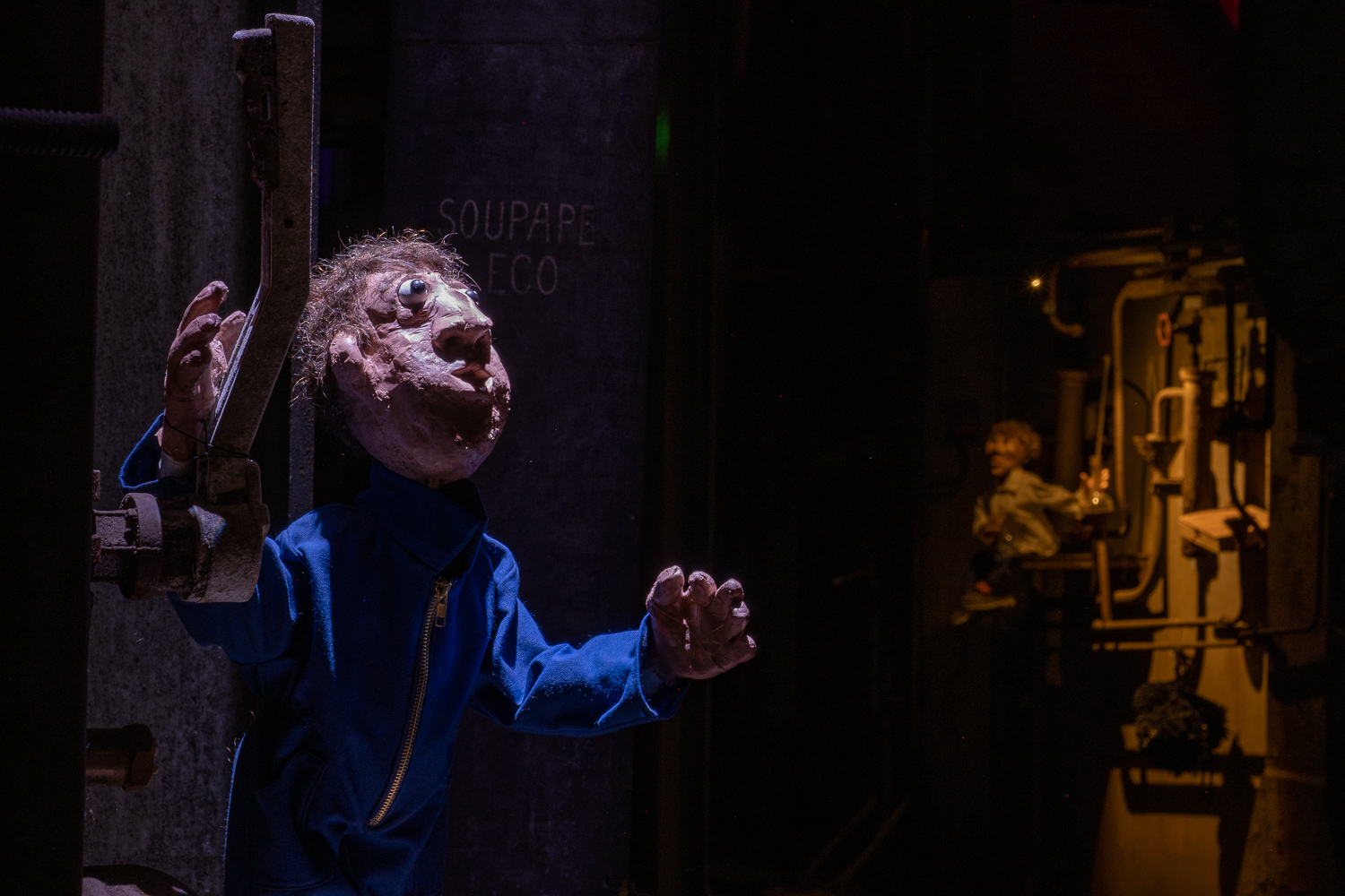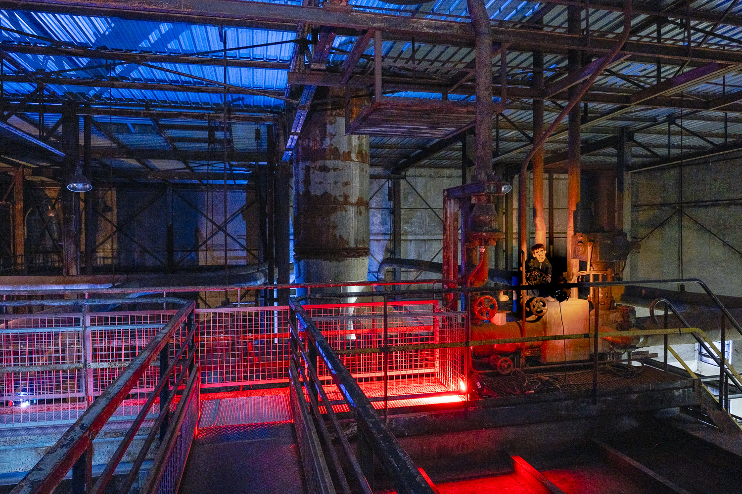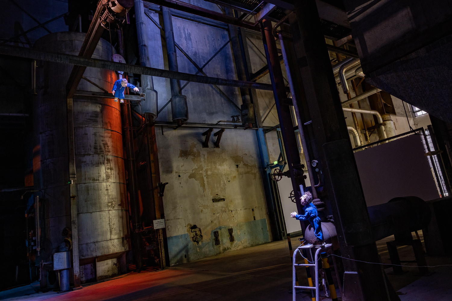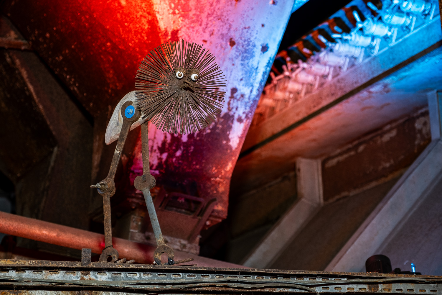 Inspirés par l’atmosphère du lieu, dédale de passerelles et de tuyaux, Martin HUBERT et Nicolas CADIOU ont conçu des ouvriers et des chimères de métal, offrant aux visiteurs une balade en sons et lumières, entre Histoire et imaginaire.