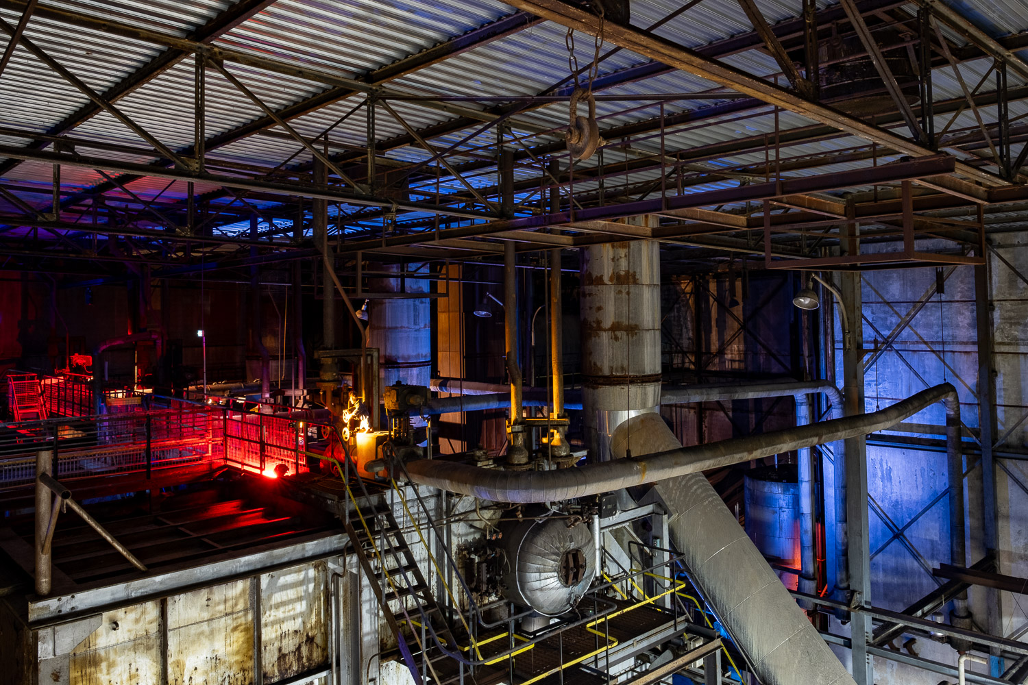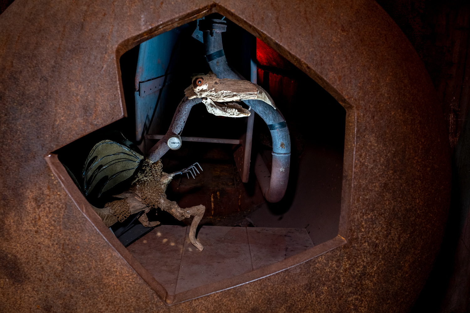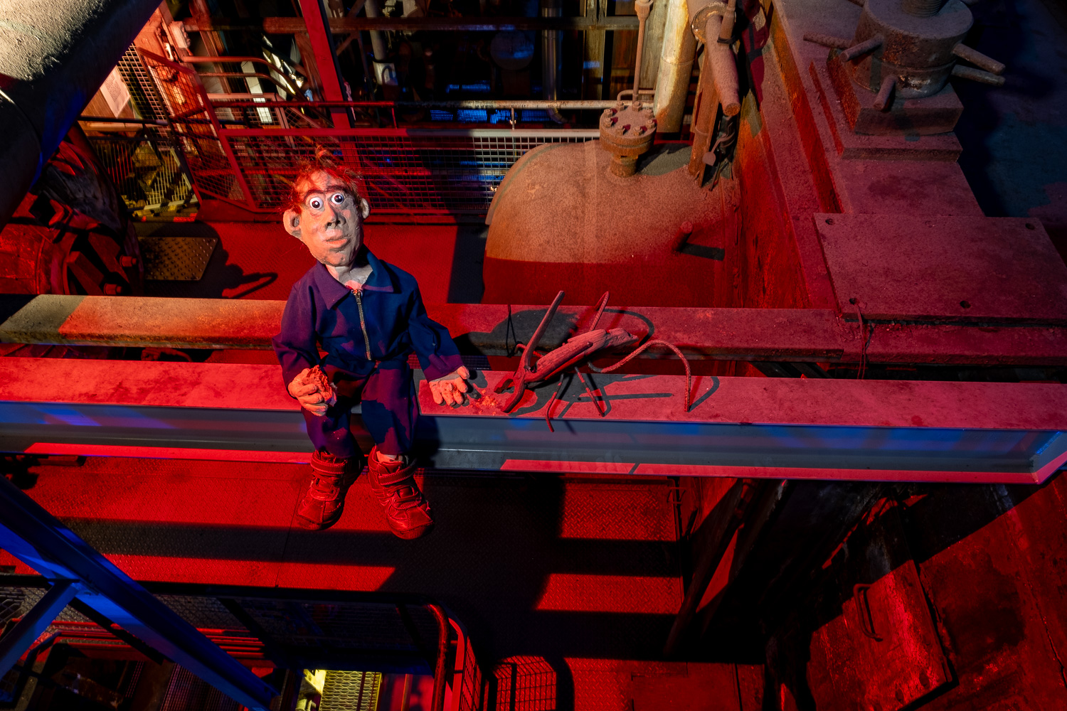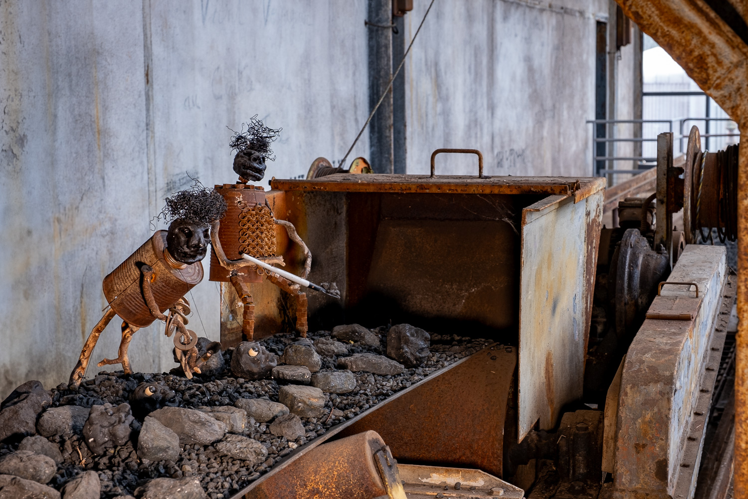 Inspirés par l’atmosphère du lieu, dédale de passerelles et de tuyaux, Martin HUBERT et Nicolas CADIOU ont conçu des ouvriers et des chimères de métal, offrant aux visiteurs une balade en sons et lumières, entre Histoire et imaginaire.